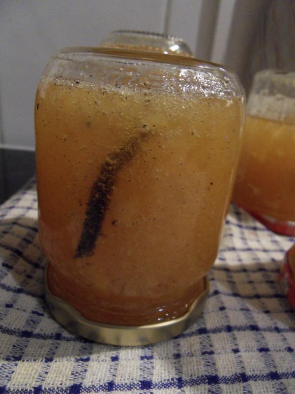 Faire cuire en ajoutant 800 G de sucre et une gousse de vanille
