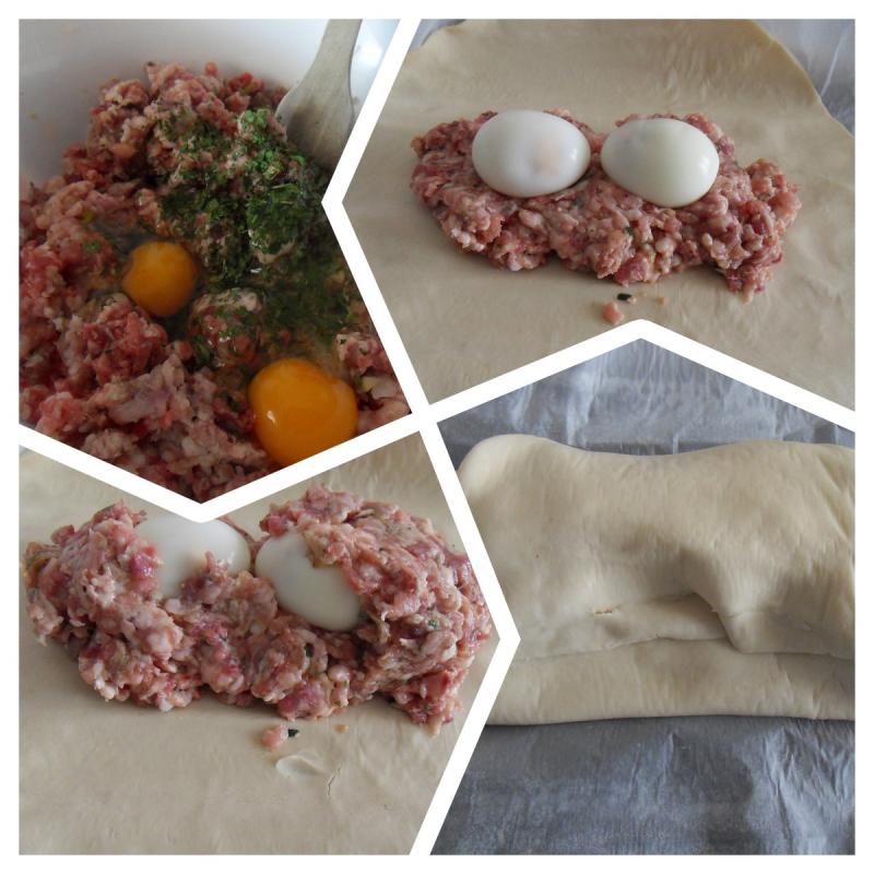 Hachez la viande, le persil, les échalottes, salez, poivrez. Ajoutez 2 oeufs pour lier la préparation Etalez la farce sur une pâte, mettre les oeufs durs froids,recouvrir de farce, fermer avec la pâte.