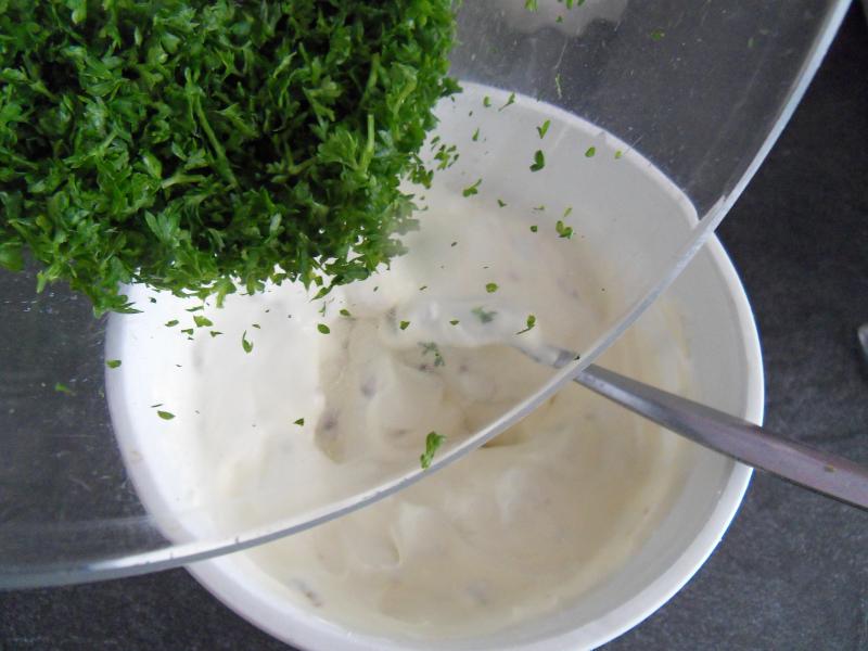 Dans un saladier battre 250 g de crême faîche épaisse , du persil frais hâché et de l'ail hâché
