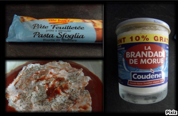 - 2 pâtes feuilletées prêtes à l'emploi, un pot de brandade, une brique de coulis de tomate, aneth Dans le fond de la pâte, étaler le coulis, recouvrir de brandade , mettre un peu d'aneth