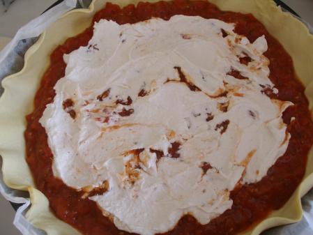 Un fond de pâte feuilletée, recouvrir de tomates concassées ou rondelles de tomates fraîches