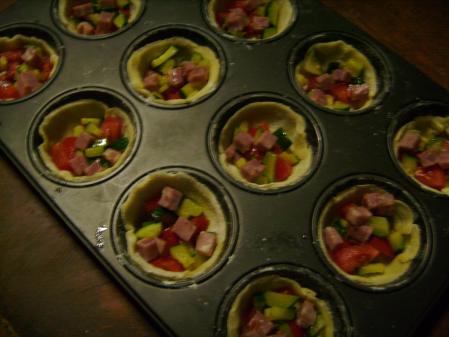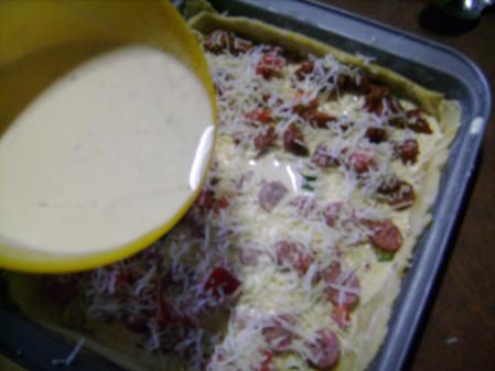 me restant de la pâte, je l'ai étalé, mise dans un moule rectangulaire, ai eu l'idée de mettre saucisse et merguez, le reste de courgette coupée en petits dés, un petit peu d'une tomate coupée en petits dés,