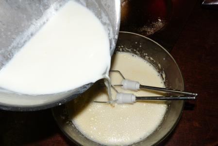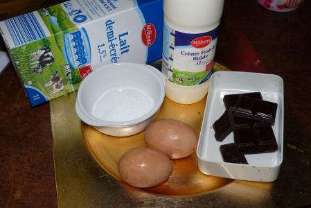 POUR LE CREMEUX AU CHOCOLAT: 10 cl de créme fraîche liquide 15 cl de lait 2 jaunes d'oeuf 40 g de sucre en poudre 100g de chocolat noir 6) dans une casserole faire bouillir la créme et le lait.