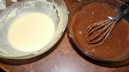 c'est un gateau avec 2 préparations, donc se préparer 2 saladiers préparation N°1 préparation N°2 500gr de faisselle égouttée 200gr de chocolat noir 80gr de sucre en poudre 100gr de beurre( ou margarine) 40 gr de farine 100gr de sucre 2 oeufs 80gr de farine 3 oeufs PREPARATION N°1 Mettre la faisselle égouttée dans un salasier, fouettez un peu, puis ajoutez les oeufs, le sucre et la farine. Mélanger pour obtenir une créme. Mettez de côté. PREPARATION N°2: Coupez le chocolat en morceaux , faites le fondre au bain marie avec le beurre.Mélangez , puis hors du feu, ajoutez le sucre,fouettez; incorporez les oeufs en fouettant, puis en dernier , ajoutez la farine et bien mélanger Beurrez et farinez un moule à manqué. Versez y la moitié de la créme chocolat, que vous venez de faire, ensuite versez dessus , toute la créme à la faisselle puis au dessus versez le reste de la créme chocolat. Pour faire le mabré, prenez un petite cuillére à café, et faites des tourniquets dans votre plat, en allant à droite, à gauche....les deux crémes vont se mélanger.... Mettre dans un four chaud (200°)th 6/7, pendant environ 30mn. ce gateau a été refait par philau masduloup je vous mets sa photo! lol a coté le mien est un plapla car j'avais mis moins d'ingredients, et avait pas plat plus petit mdr