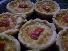 2 oeufs 1 pâte brisée quelques cernaux de noix poivre+(muscade, suivant goût) 1 boîte de boursin ail et fines herbes 1) Préchauffer le four à 180° (th 6/7) 2) Tapisser les moules avec la pâte brisée 3) Dans un saladier, mélanger la moitié d'une boîte de boursin avec les 2 oeufs.puis poivrer. 4) Remplir les moules. Enfourner. 5) Au bout de 15 minutes, décorer avec les cernaux de nois et remettre au four 15 minutes. |