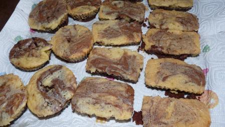 3 ou 4 oeufs MEME POIDS EN beurre, farine, sucre. 1 sachet de levure chimique 100 g de chocolat patissier PREPARATION: 1) Mettre à fondre le beurre au micro ondes. Quand celui ci est fondu ajouter le sucre, bien fouetter. 2) Ajouter les oeufs en entiers, mélanger bien. 3) Ajouter ensuite la farine et la levure.Mélanger bien à nouveau. 4) Faire fondre le chocolat au micro ondes. 5) Dans un autre saladier, mettre le chocolat fondu et la moitié de la pa pâte(premiere preparation). Mélanger bien. 6) Verser la pâte au chocolat das le moule a cake, ou à manqué ou dans des petits moules. 7) Verser sur la pâte au chocolat qui se trouve dans vos moules, la pâte nature. Faire des mouvement circulmaire avec une fourchette. 8) Faire cuire au four chaud, th5/6 (170°) pendant 1- 40/50 minutes pour des grands moules 2- une dizaine de minutes pour petits moules. 9) A la fin de cuisson, démouler et laisser refroidir avant de servir! les moules au four: les voilà cuits! il est vrai que dans les petits moules pas évident de touiller!! mais bon, par contre la prochaine fois je ne mettrai qu'un demi-sachet de levure! a vous de voir!