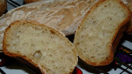 100 gr de beurre 150 gr de pépites de chocolat noir 1 kg de farine 40 gr de levure de boulanger 60 gr de sucre semoule 45 cl d'eau 2 oeufs 20 gr de sel PREPARATION:( prechauffer le four a 210°) 1) Former un puits avec la farine. 2) Versez le sucre, la levure, le sel, l'eau et les oeufs au milieu du puits.Mélanger le liquide avec le boout des doigts en récupérant un peu de farine pour former une pâte épaisse. 3)Rassembler la farine au centre du puits, mélanger jusqu'à l'obtention d'une pâte. 4) Pétrir la pate en l'étirant afin de la rendre élastique(environ 10 minutes) ajoutez les morceaux de beurre et les pépites de chocolat,pétrir 5 bonnes minutes 5) Laissez lever pendant 20 minutes à température ambiante, divisez votre pate en 4 morceaux égaux. faire des baguettes. 6) Poser sur une plaque de cuisson et laisser reposer 1h30. Dorer les baguettes avec un oeuf battu, inciser à l'aide d'un couteau Cuire à 210° pendant 20 minutes environ