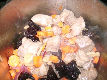 6) lorsqu'ils sont légérement revenus, ajouter le sauté, les carottes coupées en rondelles, les champignons et les pruneaux.