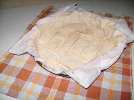Abaisser la pâte en un disque pas trop grand( il doit être adapter à la taille du beurre, c'est à dire que les angles du carré se posent sur la circonférence du disque- à quelque chose prés-.(on n' est pas parfait) Couvrer le beurre avec la pâte qui dépasse.