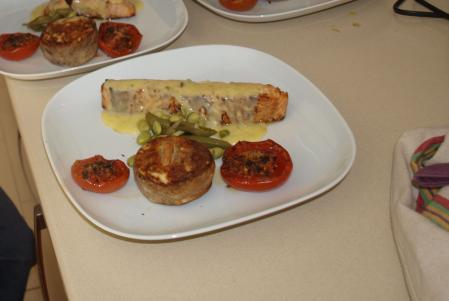 Tomate coupé en dé, puis mettre le saumon , pomme coupé en lamelle et un peu de fromage arrosse d'huile d'olive