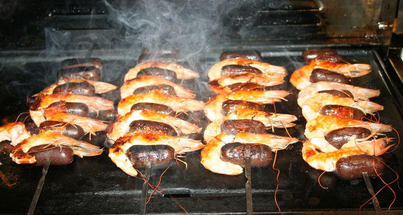 Ingrédients pour 4 brochettes : 20 crevettes géantes (gambas), 24 petits boudin antillais ou Autres. Pour la marinade : 25 cl de vin blanc, 2 cuillères d'huile d'olive, 1 piment rouge, Le jus d' 1 citron vert, 1 cuillère de piment de Cayenne moulu. 8 heures à l'avance faites mariner les gambas en les retournant régulièrement. Décortiquez les queues des gambas. Montez les brochettes en alternant boudins antillais et gambas. Préchauffez la plancha, déposez-y les brochettes et laissez griller 3 minutes de chaque côtés.