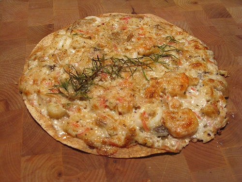 4 Tortillas 10" minces ou pate à pizza 170 g. de goberge 230 g. de crevettes taille 31-40 300 g. de pétoncles mini 150 g. de calmars 170 g. de poireaux 170 g. de pleurottes 350 g. de sauce alfredo au plus vite si non faites votre sauce maison à la sauce tomate, tomates fraiche et herbes 300 g. de sauce béchamel 125 g. de fromage à pâte molle Cendre Després 100 g. de fromage de type Reggiano 4 branches de romarin Préparation Faire sauter tous les fruits de mer, le poireau et les pleurottes quelques minutes. Mélanger avec les sauces, incorporer le fromage à pâte molle et remuer à feu doux jusqu'à ce que le fromage soit fondu. Faire sécher et durcir les pitas au four à 250f quelques minutes. Étendre la préparation sur les pitas, garnir du reggiano et de la branche de romarin. Cuire 15-20 minutes à 325, finir à 350 pour dorer. |