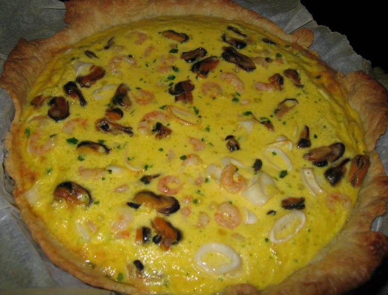 3 œufs + 2 jaunes bio, 25 cl de crème fraîche bio, noix de muscade , 3 c. à soupe de persil ciselé, 3 échalotes (ou ajoutez 5 c. à soupe d'échalotes surgelées), 2 c. à soupe d'huile d'olive, 500 g de fruits de mer sel. Préchauffer le four à th. 210°c. Dans un moule à tarte téflon, déposer la pâte brisée préalablement piquée à l'aide d'une fourchette. Fouetter 3 œufs et 2 jaunes, 25 cl de crème fraîche. Saler. Ajouter de la noix de muscade et 3 c. à soupe e persil ciselé. Éplucher,émincer 3 échalotes (ou ajouter 5 c. à soupe d 'échalotes surgelées). Les faire revenir dans 2 c. à soupe d'huile d'olive. Ajouter 500 g de fruits de mer Faire sauter le tout 2 min à feu vif. Disposer les fruits de mer sur le fond de tarte. Puis verser le mélange aux œufs et cuire au four 5 mn. Baisser la température à 180°c et poursuivre la cuisson 5 mn environ jusqu'à ce que la quiche soit dorée. |