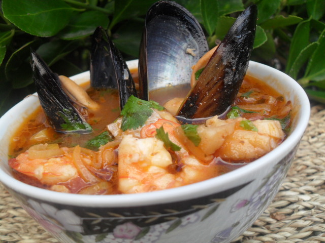 2 poireaux en fines rondelles 1 branche de céleri en fins tronçons, 2 gousses d'ail écrasées 250 g de pommes de terre en cubes 100 g de tomates séchées, égouttées,hachées 1 boite de 400 g de tomates en dés 1.25 l de court-bouillon 1 c à café de sucre 350 g de filets de poissons blancs fermes 250g de crevettes moyennes crues 2 c à soupe de persil finement haché Sel, poivre, piment. Chauffez l'huile dans une grande casserole, ajoutez le poireau, le céleri et l'ail, et faites fondre 2-3 min à feu moyen. Ajoutez les pomme de terre et les tomates séchées et remuez 1 -2 minutes. Ajoutez les dés de tomate, le bouillon et le sucre. Portez lentement à ébullition, réduisez le feu et laissez mijoter 15 min , à couvert. Retirez la peau et les aretes des filets de poisson, et coupez les en cubes. Décortiquez les crevettes et retirez doucement la veine sombre de leur dos en commençant la tete. Ajoutez le poisson dans la casserole et laissez doucement mijoter 5 min , ou jusqu'à ce qu'il soit presque cuit. Ajoutez les crevettes et laissez cuire 3 min , jusqu'à ce qu'elles soient cuites. Salez et poivrez Ajoutez le piment et le persil en remuant. Servez accompagné de pain croustillant. J'ai ajoté quelques moules . Bon appétit! |