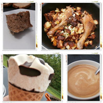 eh bien me revoila avec mes petits repas - il y avait bien longtemps que je n avais rien fait car personne n etait venu me rendre visite dimanche donc mon fils etait là pour le week end donc l occasion de cuisiner un petit peu - je passe donc sur le merguez/frites et croque monsieur/salade du samedi pour vous dire ce que j avais fait dimanche tout d abord carottes rapees (du jardin) avec du celeri remoulade puis des magrets de canards (encore!) en papilottes au barbecue avec une marinade à base de figues/vinaigre de figues/huile d olive/thym/laurier/herbes de provence servis avec les figues confites ensuite dans du vermouth - des cèpes de pin - et des topinambours - du riz (surtout pour les enfants) - fromages et crèmes brulees au zeste de citron - avec un petit bordeaux et en aperitif les croissants de "guillaumette" à la saucisse moutardée (très bon et facile à faire) choses que je n avais jamais ose faire - j ai pelé les topinambourgs et cuits à la poele comme des pommes de terre - ail/persil/sel/poivre et voila un délicieux accompagnement. bref du soleil toute la journee de quoi passer un bon week end et en plus les enfants ont ete sages - |