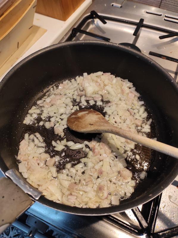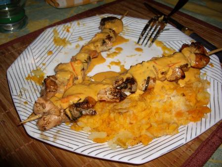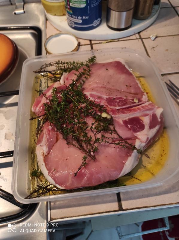 - en entrée soupe de légumes au kiri (la soupe à base de courgettes que j avais congelée cet été et à laquelle j ai rajouté du kiri) - sauté de porc : j ai fait revenir des oignons dans de l huile d olive, puis un filet de porc coupé en petits morceaux, saupoudré de farine, puis recouvert d eau, 3 feuilles de laurier frais et j ai laissé mijoter sur la plaque electrique 3/4 heure - ensuite j ai rajouté un bocal de champignons de l an dernier (cèpes/oronges/pibles/mousserons) et des pruneaux mi-cuits et en fin de cuisson j ai mis un peu de crème fraiche pour bien lier la sauce - le tout servi avec du riz thai - fromage : de la tome fermière du Temple sur Lot et un fruit en dessert |