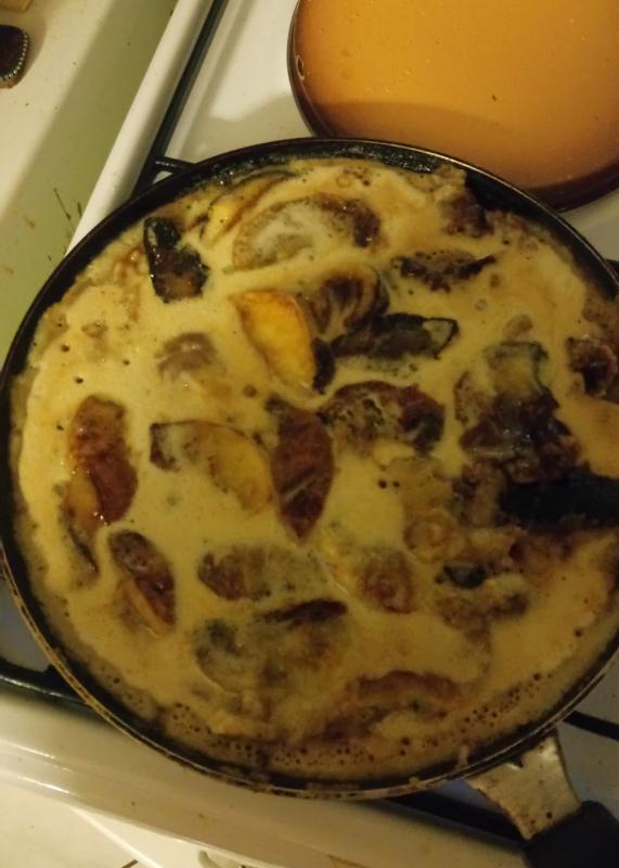 l an passé nous avions fait du vin de noix qui a "fermenté" - le temps passant il pétille beaucoup moins mais reste désagréable à boire en apéritif.... dommage mais c est comme cela alors dimanche j ai eu l'idée d'en faire une petite sauce pour accompagner un reste de jambon que nous avions fait pour les fiancailles de ma fille au mois de juin : j ai fait fondre 2 échalottes dans du beurre - ensuite j ai versé ma bouteille de vin de noix, fait réduire pendant plus d une heure à feu très doux - j ai rajouté du boursin cuisine au poivre - rajouté une bonne pincée des poivres rouge/vert/noir passés au pilon - et pour finir 2 grosses cuillères de crème fraiche épaisse - cette sauce avec le jambon qui avait cuit enrobé dans une croûte de miel/jusde pomme/canelle/clou de girofle c'était un régal |