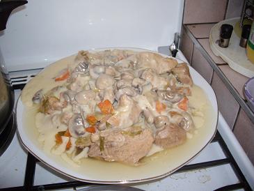 alors je les ai fait revenir dans un peu de beurre, puis j ai rajouté un peu de vin blanc, un peu d eau avec un bouillon de poule, une sauce tomate maison, une boite de champignons, des pommes de terre et j ai fait mijoté tout cela pendant 1h 1/2 - sel/poivre/un peu de piment et du persil et voilà mon repas d hier soir fait !!! pour ce soir j ai prévu : du celeri branche cuit à la vapeur et revenu ensuite à la poêle avec des lardons (et un peu de crème fraiche pour finir!) |