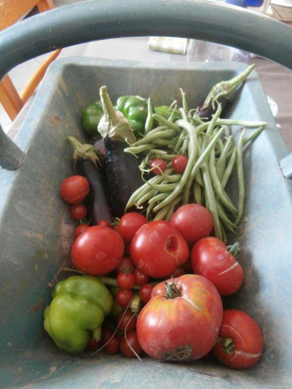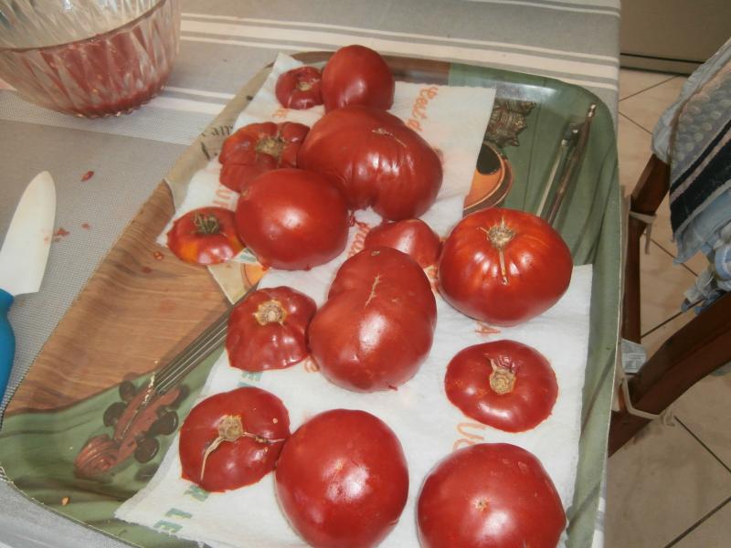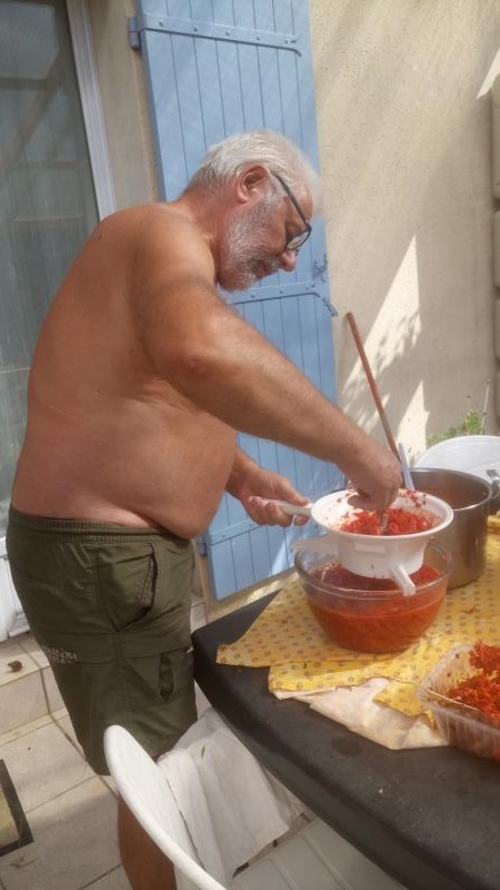 nous avons ramassé toutes les tomates cerises du jardin (et il y en avait!!!) les tomates normales et nous avons passé la journée à faire le coulis pour mettre au congélateur pour faire toutes les sauces tomates et autres soupes de l hiver - cette année j ai mis des tomates, du laurier, du thym, du basilic et tout cela à mijoter pendant 2 heures puis passé au moulin à légumes (le boulot de Monsieur!!!) remis à mijoter pendant 3/4 heures et enfin dans des bouteilles de lait vidées, au congélateur