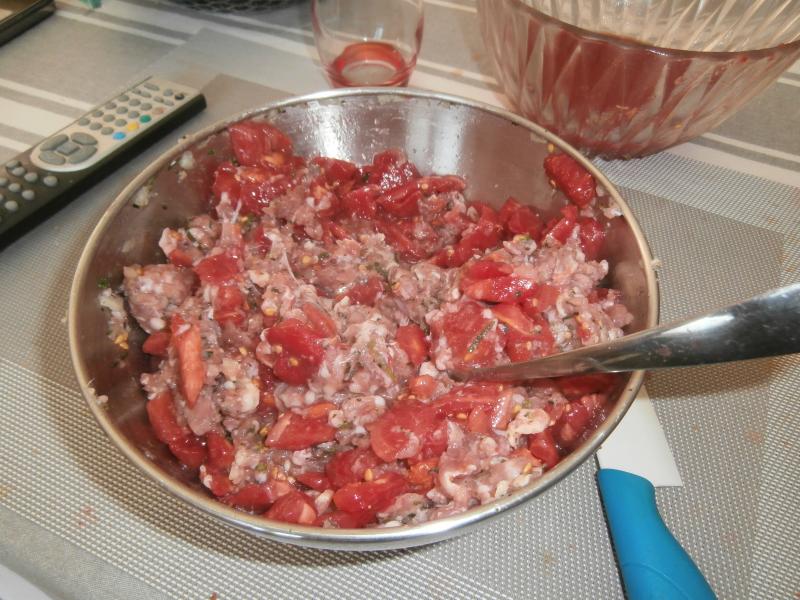 pour la chair à pâté : je passe au hachoir de la viande de porc (en ce moment il y a beaucoup de "foire aux porcs" - je prends de la longe et de la gorge, du foie, du lard) et après j assaisonne cette chair hachée avec du sel/poivre/épices/3 oeufs par kilo et ensuite avec le goût que je veux leur donner : des noix hachées, de l' échalotte, des champignons noirs en lamelles séchés ou simplement nature - cette fois ci j ai un peu triché, j ai acheté la farce déjà prête et j ai seulement assaisonné - je mets dans les bocaux et à stériliser 2h1/2 - 3 h - laisser refroidir dans l'eau et étiquetter et ranger dans la cave (du moins au frais) et consommer le plus tard possible - |