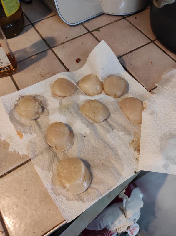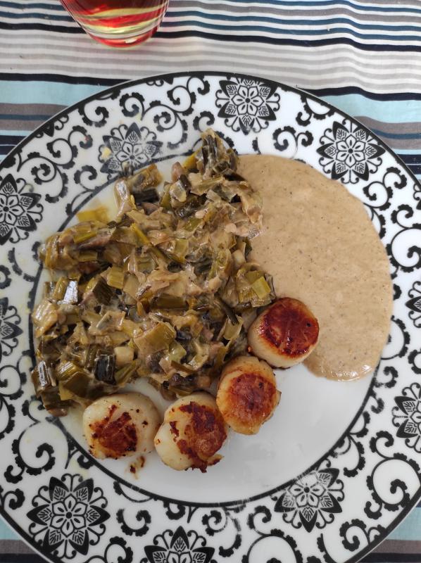 ce dimanche pour contrer le mauvais temps ambiant, j avais préparé un bon déjeuner : - apéritif au vin de noix maison avec petits toasts oeufs de lump - saumon fumé sur lit de salade accompagné de blinis/crème fraiche au sel aux baies roses+piment de cayenne et brins de ciboulette fraiche - terrine de st jacques (de chez le marchand) sur fondue de poireaux au sel à la vanille+piment de cayenne+aneth avec une sauce hollandaise relevée au piment et pour finir mon tiramisu - le tout accompagné d'un petit muscadet et voilà de quoi contrer la tristesse de cette journée pluvieuse, venteuse, orageuse parfois bref journée de m...... |