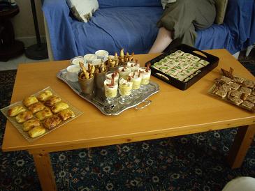 au menu de ce 1er mai : apéritif/entrée fait avec des canellés à la poudre de soupe déshydratée - des madeleines salées aux olives/à la tomate - des nems aux champignons/cantal et lardons - des chaussons au saumon fumé - des toast roulés au saumon fumé - et le must MA MOUSSE AU SAUMON (plat favori de mon fils) et que j avais particulèrement réussi cette fois car tous sont repartis avec leur petit tupperware (recette à suivre) ensuite j avais fait un curry de porc avec des pommes de terre cuites au cuit-vapeur assaisonnées avec un peu de crème fraiche du persil et de sel de guérande parfumé aux baies roses du camembert au caramel poivré avec de la salade et en dessert des coupes de compote de pommes aux spéculos le tout arrosé d un petit grave de 2004 et une bouteille de champagne - |