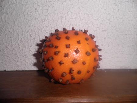 Si vous êtes comme moi,que vous ne vous servez pas de votre cheminée tous les jours;pensez à mettre des bougies dans le foyer,des grosses,des petites,et vous verrez comme celà "réchauffera" votre déco,surtout le soir venu!!! J'ai entouré cette grosse bougie d'une bande de toile 'aïda'brodée aux points de croix. Encore une petite déco qui ne coûte pas grand'chose,une orange 'piquée' de clous de girofle,qui répand sa bonne odeur....