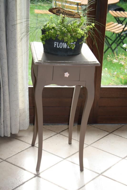 Quand j'ai acheté cette table,j'avais eu un coup de coeur pour ses pieds si joliment galbés et pour le petit tiroir (comme quoi les coups de coeur ne tiennent pas à grand-chose!!!);j'ai changé le bouton en laiton pour un 'bouton fleur'....