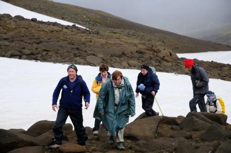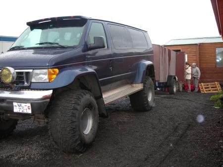 Nous faisons connaissance de François le guide Belge venu s'installer ici et Alf, le chauffeur islandais, qui vont nous accompagner pendant ces 12 prochains jours. Nous sommes finalement un groupe de 11 personnes plus eux deux. Nous apprenons que nous ferons la grande boucle Islandaise à l’envers du programme prévu, ce qui va nous demander un peu de gymnastique mentale, nous qui avions déjà bien eu du mal à repérer le programme avec tous ces noms bizarres. Et nous partons pour l’aventure en gros 4X4 (absolument indispensable pour traverser certaines rivières et rouler sur les pistes cahotiques du centre de l'île) auquel est attelée une remorque pour nos bagages, et des caisses de vaisselle et de nourriture. Mon dictaphone, récemment acheté pour la circonstance, va me servir à capturer les nombreuses explications données par François tout au long de l’itinéraire.