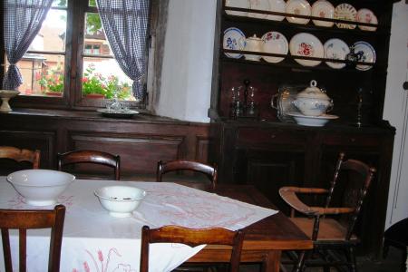 Sur l'étagère on voit bien le "ASKUR", bol cylindrique de bois à couvercle qui servait d'écuelle avec une cuillère de bois.