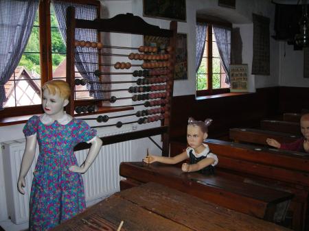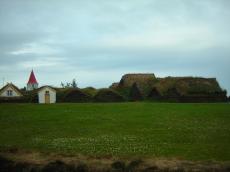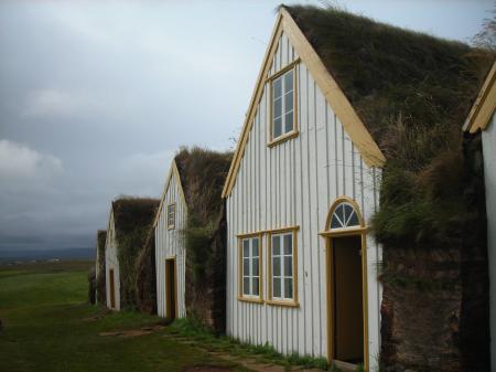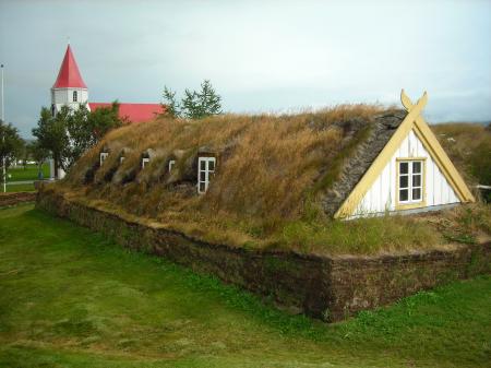 Pour affronter la rigueur de l’hiver si long en Islande, la maison traditionnelle s’enfouissait dans la tourbe et les toits étaient recouverts de gazon. Elle est constituée de plusieurs bâtiments bien séparés. Les pièces de la maison principale sont reliées entre elles par un grand couloir. Les deux premières pièces étaient réservées aux amis auxquels on offrait l’hospitalité. Les bâtiments de cette ferme écomusée datent du 18ème et 19ème siècle. C’est ainsi que le monde qui était rural vivait. Il faut imaginer qu’en Islande, la création des villes est un phénomène extrêmement récent. A cette époque l’unité principale d’habitation sur l’île était la ferme un peu étoffée. Donc il n’y avait pas uniquement que le fermier, la fermière et leurs enfants Il y avait aussi des aidants, du personnel, peut-être aussi des enfants adoptés. Les gens y étaient divisés en classes sociales. Chacun avait droit à une certaine quantité de nourriture par jour. C’était calculé. La vie était très rude et l’éducation des enfants également. Les fermiers attachaient les enfants pendant que les parents allaient travailler dehors. Les mœurs n’ont commencé à s’adoucir que vers le milieu du 19ème siècle. Jusque là la ferme représentait une société très fermée et cruelle. Les condamnations pour vol étaient terribles et la délation fréquente. Ce sont les parents qui assuraient l’éducation de leur enfants et leur apprenaient à lire, car l’alphabétisation des islandais étaient supérieure à la moyenne européenne. Des diseurs d’aventures, d’histoires s’arrêtaient de ferme en ferme jusqu’à la fin du 19ème siècle. C’était un métier en soi. La pièce du fond contient 11 lits ce qui logeait environ une vingtaine de personnes. Cette pièce servait à la fois de chambre, de pièce de travail et de salle à manger. Les gens faisaient tout sur leur lit. Les femmes filaient la laine de mouton entre leurs doigts et tricotaient près des fenêtres. Le rouet est arrivé plus tard. Chacun avait sa propre planche de bois sur le bord du lit sur laquelle il inscrivait sa propre phrase bienveillante, symbole de protection de la vie privée (l’espace du lit !). Ce n’était pas des lits longs, car les gens dormaient presque assis par superstition. Pour s’éclairer, ils allumaient des lampes dont la mèche était faite avec la fleur duveteuse de la linaigrette, plante que l’on trouve un peu partout sur l’île. Dans le Nord de l’Islande, jusqu’au début du 20ème siècle, il y a eu des périodes terribles de famine. Lors de la dérive des glaces, si la banquise entourait la côte, cela bouleversait complètement l’écologie. Quand les gens voyaient arriver la glace dans les fjords, ils savaient que cela signifiait la détérioration du climat et du sol et donc pour eux la mort. Ce n’était pas un pays où l’on pouvait facilement bouger et s’implanter n’importe où en cas de danger. Au 20ème siècle les fermes se sont équipées progressivement en électricité grâce à des turbines que chaque ferme installait pour utiliser l’eau des rivières. Les dernières fermes avec le toit en gazon on été habitées jusque dans les années 60.