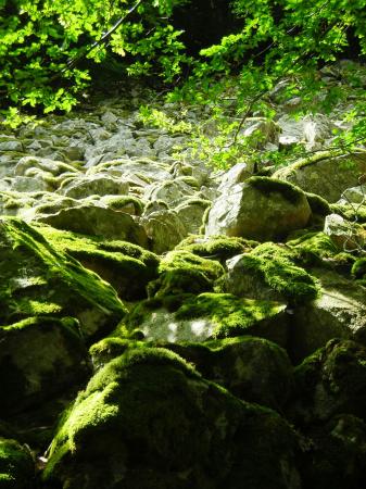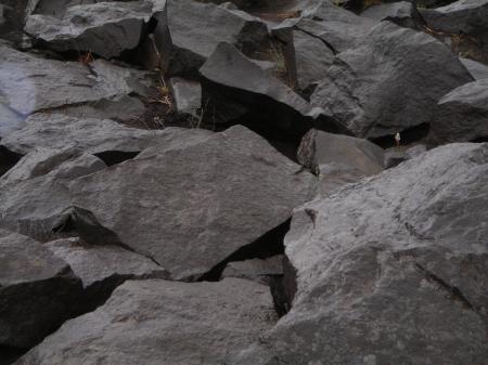 Le cadre de la cascade, c’est un grand amas de pierres. Ce sont en fait des morceaux de lave basaltique, qui ont été charriés par la rivière à toutes les époques.