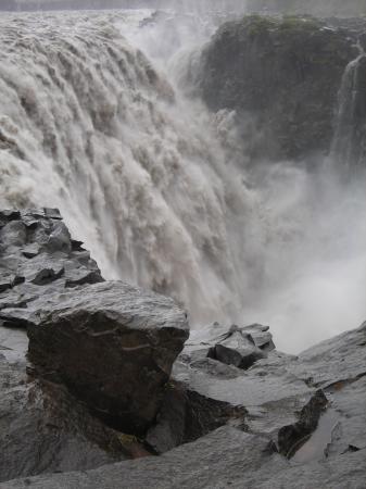 La cascade de DETIFOSS est connue pour sa force. Le débit moyen est de 130 m3/seconde. A l’époque de la fonte des neiges au début de l’été et aussi en cas d’éruptions volcaniques sous la glace de VATNAJÖKULL, il peut atteindre 350 m3/seconde ce qui semble pourtant inimaginable.
