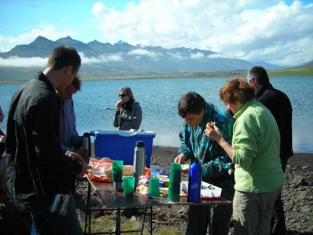 La matinée démarre après le petit-déjeuner par une « leçon » sur la géologie et la vulcanologie de l'Islande et principalement autour du lac Myvatn. Nous essayons d'y comprendre quelque chose. Sachons tout d'abord que l'Islande est traversée par le passage de la ride médio-atlantique. C'est une immense chaîne volcanique sous l'océan.