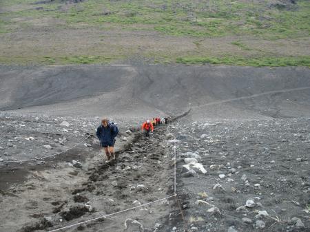 Devant nous maintenant, s’étend, de part et d’autre de la piste, un désert de lave de pierre ponce très coupante. Il y a moins de végétation et il y en aura de moins en moins sauf à quelques endroits où nous trouverons des petits oasis. Nous entrons dans le désert de lave de ODADAHRAUN. « ODADAHRAUN » signifie littéralement « champ de lave des crimes ». Jusqu’à il y a environ deux siècles, les condamnés à mort étaient laissés à l’abandon dans ce champ de lave et n’avaient pas le droit de revenir sur la côte. Il faut imaginer comment la vie était difficile ici dans un environnement comme celui-ci où il n’y a pratiquement pas d’eau en surface et où bien sûr on est très exposé au vent, au froid et à la pluie. Peu de condamnés survivaient à cette expérience sauf les quelques uns qui réussissaient à s’installer dans un des rares oasis que l’on pouvait trouver dans cette région.