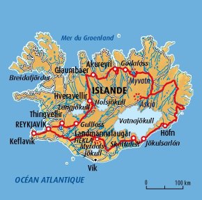 Tu as raison Parrain Jean-Pierre, il est temps que je précise l'itinéraire que "Terres d'Aventure" a concocté pour cette grande boucle islandaise de 15 jours cet été. Je fais ici connaissance avec l'écriture de la difficile orthographe des noms de ce pays ! ça va être également difficile pour moi maintenant, mes amis, de rester patiente et laborieuse jusque juillet ... heureusement j'ai encore besoin de parfaire mon paquetage et mon entrainement de cinquantenaire... Si vous voulez suivre sur la carte (ci-dessous) : - Paris/ Keflavik et transfert à Reykjavik - Landmannnalaugar ( volcan Hekla, pentes du Blhnukur, source d'eau chaude, réserve naturelle, plateaux de Hrafntinnusker) - Piste de Fjallabak (faille d'Eldgja, vastes landes, parc national de Skaftafell, lagune glaciaire de Jökulsarlon) - Egilsstadir (entrée deans les hautes terres inhabitées du Nord-est) - Caldeira d'Askja (gorges du dragon, baignade dans les eaux sulfureuses de viti) - Réserve naturelle de Herdubreid, lac Myvatn, caldeira de Krafla - Godafoss (chute des dieux) - Ville d'Akureyri au fond de l'Eyjarfjördur - col d'Öxnadalsheidi pour rejoindre le fjord Skagafjördur (écomusée de Glaumbaer) - Hveravellir (manifestations géothermales et source chaude, vallée des fumées de Reykjadalur dans le massif des Kerlingarfjöll, montagne de la sorcière) - Piste de Kjölur ( Cataracte de Gulfoss, Geysir et le geyser Strokkur , vallée du Parlement à Thingvellir) - Reykjavik - Paris (hélas!)