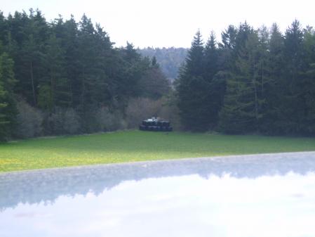 du retour, au fond du pré, juste à la limite ombre-soleil, une biche qui paissait tranquillement mais je ne sais pas si on va la voir bien ici lol le petit point noir juste devant les ballots de foin, mais dans l'ombre