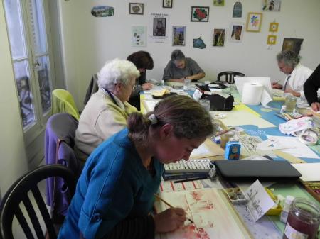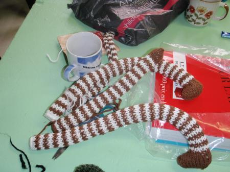 aprés midi club ,chacun vaque à ses activitées ,Véro brode, Martine tricote un chien
