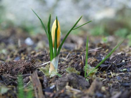 Je surveille tous les jours mes deux parreterres devant la maison et à part mes perceneiges en fleur, je vois sortir de terre tout doucement les feuilles de tulipes, les quelques boutons des jonquilles et la .. tout d'un coup, mon premier crocus, allez hop, un petit tour d'appareil photo et hop. ne pouvant me mettre à plat ventre j'ai posé mon appareil à meme le sol