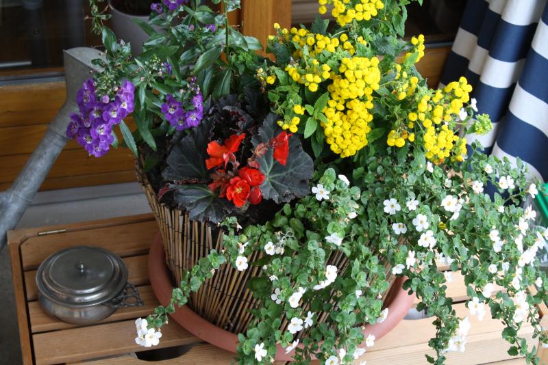 Nous avons : bleu violacé un angelonia gardenari jaune : un gloxinia blanc : un bacopa sutera cordata rouge : un bégonia tubéreux