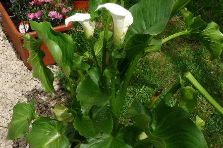 l'arum que j'ai mis en terre, car il m'aparaissait se fatiguer en pot! chouette le trou était dejà fait par les chiens, car l'été dernier ils l'avaient fait (surtout Marquise) sous la voiture!