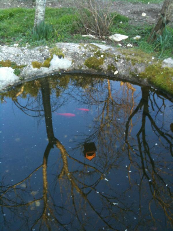 j'ai été faire un petit tour dans le sous bois , les feuilles tombent et bien sur dans le bassin des poissons également, donc il est dit que regarder des poissons tournaient en rond cela apaisait!!! donc j'ai regardé, nettoyé avec le filet pour les feuilles mortes et il y a quelques temps, j'avais apperçu des petites bestioles??? mais là!! j'ai une petite nichée de poissons qui se planquent autour des iris!! je ne sais combien mais on verra bien, là je suis rentrée car les feuilles tombent mais le soleil est encore de la partie!!!bonne fin de journée à toutes et tous cloclo
