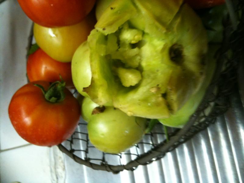 après les grêlons, la pluie bin voilà ti pas que mes belles tomates encore vertes mais pas touchées par le mauvaisont des taches et qu'elles pourrissent!!!