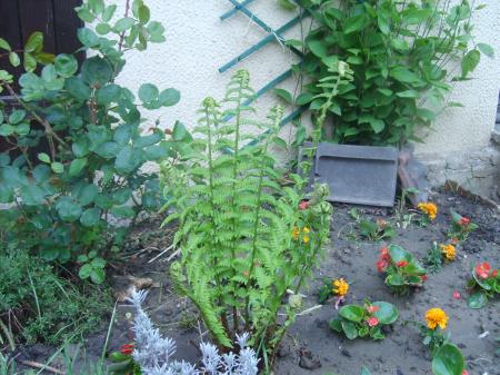 dans ce petit massif,exposé en plein sud,j'ai repiqué des petits bégonias,ainsi que quelques oeillets d'inde,ce sont des plantes pas trop exigeantes et celà m'arrange bien!