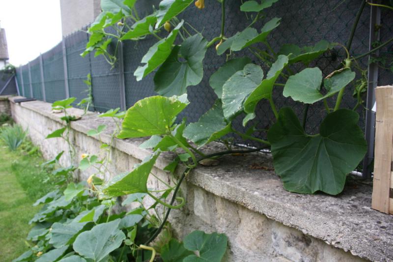 2 jardinières sur ce muret,au dessus des touffes de joubarbes,avec,en arrière plan la vigne et;en ce moment la 'monnaie du pape'.