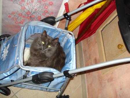 Nous avons du acheter une poussette pour notre roxy car le pauvre est cardiaque et perd ses pattes,ce qui fait que dès que l'on se balade au bout de 15min c'est pour lui lamentable et il se couche et n'en veut plus.......enfin tout ça pour expliquer que aujourd hui .............mimi notre chat a trouvé ca plutot sympa une poussette pour chien!!!!!