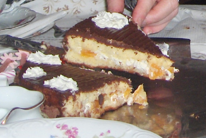 * Etaler sur la partie inférieure de la crème chantilly et y déposer les quartiers de mandarine. (Après avoir, au préalable, retiré les peaux et pépins de ces quartiers) * Remettre la partie supérieure. * Préparer le glaçage au chocolat ( - lien vers la recette du glaçage - ) * L'étaler sur les dessus et côté du gâteau et faire des stries au couteau sur le dessus. * Laisser reposer 2 heures avant de terminer la décoration avec des copeaux de chocolat sur le côté et le restant de chantilly sur le dessus.
