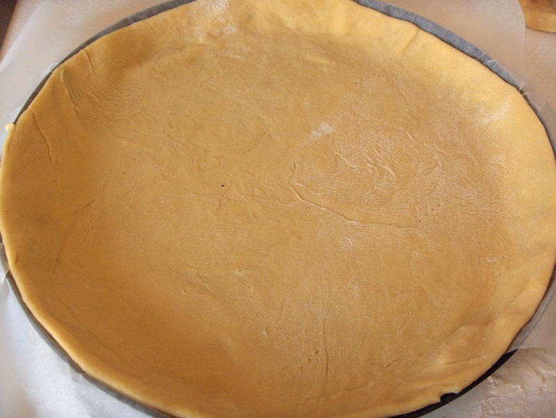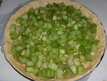 - Une pâte feuilletée, ou brisée ( - lien de la recette - ), ou levée ( - lien de la recette - ). Mon conseil : Meilleur avec la pâte levée, puis feuilletée. - une belle botte de rhubarbe pelée et coupée en gros dés - 2 c. à soupe de crème fraîche - 2 oeufs - 125 g de sucre - un peu de lait - 1 c. à café de maïzena - le blanc d'oeuf (restant de la pâte levée) * Étaler la pâte dans un moule, piquer le fond. * Et, y disposer les tronçons de rhubarbe.