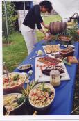 100 gr de couscous précuit moyen. 1/2 grappe de raisins noir. 1/2 grappe de raisin blanc. 1/2 poire. 25 gr de raisins secs. 2 oranges. 30 gr de sucre poudre. 50 gr de fruits rouges . ( en ce moment , des mures ou des fraises 4 saisons ). 1 bouquet de menthe. 3 cl d'eau de fleur d'oranger. Verser le jus des oranges dans un saladier avec l'eau de fleur d'oranger, ajouter le sucre, verser le couscous en pluie, ajouter les raisins secs et laisser gonfler 1 heure . Peler la poire , couper en brunoise. couper les raisins en 4. Laver et ciseler la menthe. Laver les fruits rouges , couper si nécéssaire. Ajouter tous ces ingrédients au couscous et réserver au moins 2 heures au frais avant de servir. |