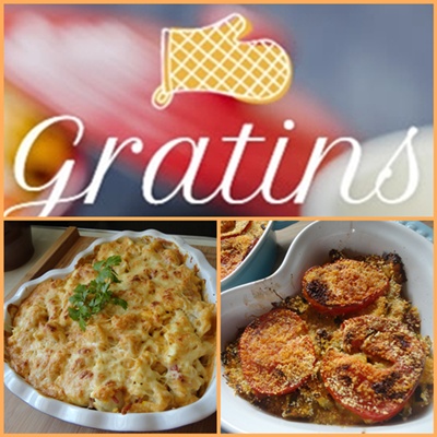 - Gratin de potimarron - Courgettine aux tomates - Gratin de chou-fleur sauce soubise - Scarpaccia de courgettes - Gratin de chou-fleur au mascarpone et moutarde - Gratin de courge musquée au jambon - Gratin de poulet aux légumes - Gratin d'aubergines au thon - Gratin de blettes à la provençale - Gratin de légumes - Gratin de courgettes à la provençale - Gratin de chou-fleur sauce tomate au thon - Gratin de lentilles corail et poivrons - Gratin moelleux de courgettes - Chou-fleur en gratin - Gratin de courgettes au chorizo